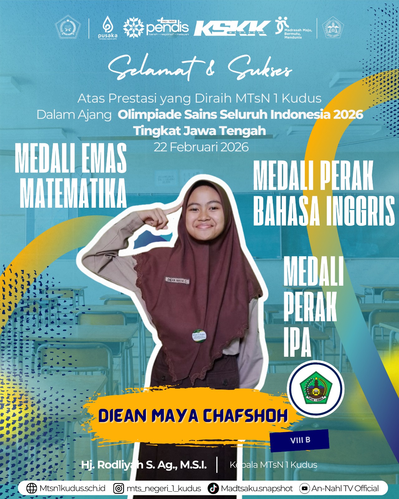 Kudus — Prestasi luar biasa kembali ditorehkan oleh siswa MTs Negeri 1 Kudus di kancah nasional. Diean Maya Chafshoh, siswi kelas VIII B, berhasil meraih tiga medali sekaligus dalam ajang Olimpiade Sains Seluruh Indonesia 2026 tingkat SMP dan MTs yang diselenggarakan pada 22 Februari 2026 secara daring melalui Zoom Online. Kompetisi bergengsi ini diselenggarakan oleh Puskanas dan diikuti oleh peserta dari berbagai daerah di Indonesia.